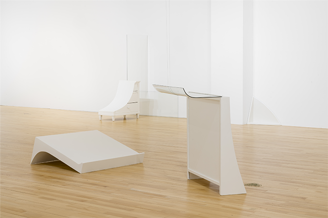 이와 더불어 작가는 수집된 오브제들을 재구성한 조각작품을 통해 또 다른 공간적 언어를 펼쳐낸다. 일부 오브제는 오래된 가구를 재사용해 만들어졌으며, 작가는 이 재료를 단순한 조각 요소로 두지 않고, 해체와 재배열을 통해 새로운 곡면과 구조를 구축해낸다. 이 과정에서 점, 선, 면이라는 기하학적 요소들은 서로의 역할을 재배치하며, 공간적 긴장을 만들어내는 동시에 연결의 흐름을 형성한다.
